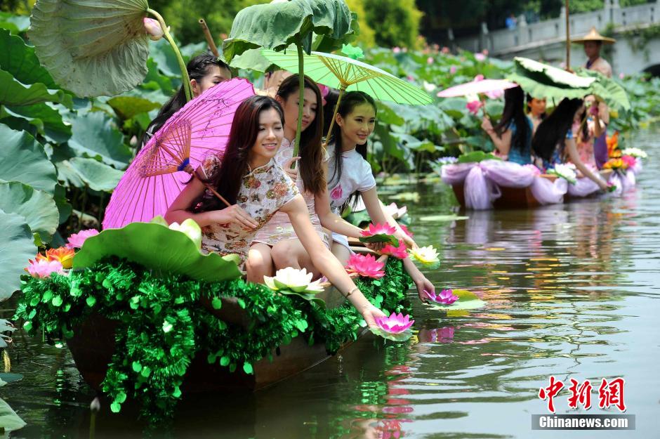 On July 19, top 10 candidates in cheongsam for 2015 Zhujiang image ambassador row boats in a lotus pond and seem like China’s “lotus fairy”. (CNS/Cui Yukun)