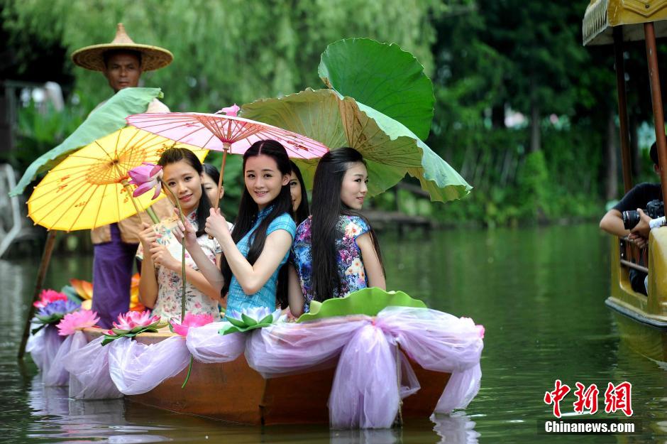 On July 19, top 10 candidates in cheongsam for 2015 Zhujiang image ambassador row boats in a lotus pond and seem like China’s “lotus fairy”. (CNS/Cui Yukun)