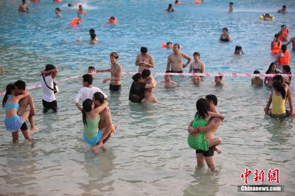 An interesting kiss contest is held in a water world in Nanning, south China’s Guangxi province on July 18, 2015. The male contestant held his partner up and kissed her in the water and the couple who held on the longest time would win. (CNS/Wang Gang)