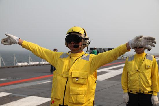 A group of photos show the training scene of the soldiers serving at Liaoning aircraft carrier. Their hand signals when directing the aircrafts make the legend 'aircraft carrier style' popular on the internet with many people posting imitations of it. (Photo/China Youth Daily)