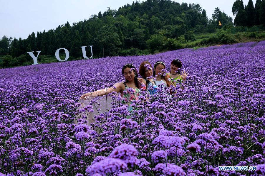 Tourists pose for photos at a lavender garden in Fenghuang County, Xiangxi Tujia-Miao Autonomous Prefecture, central China's Hunan Province, July 20, 2015. (Xinhua/Peng Biao)