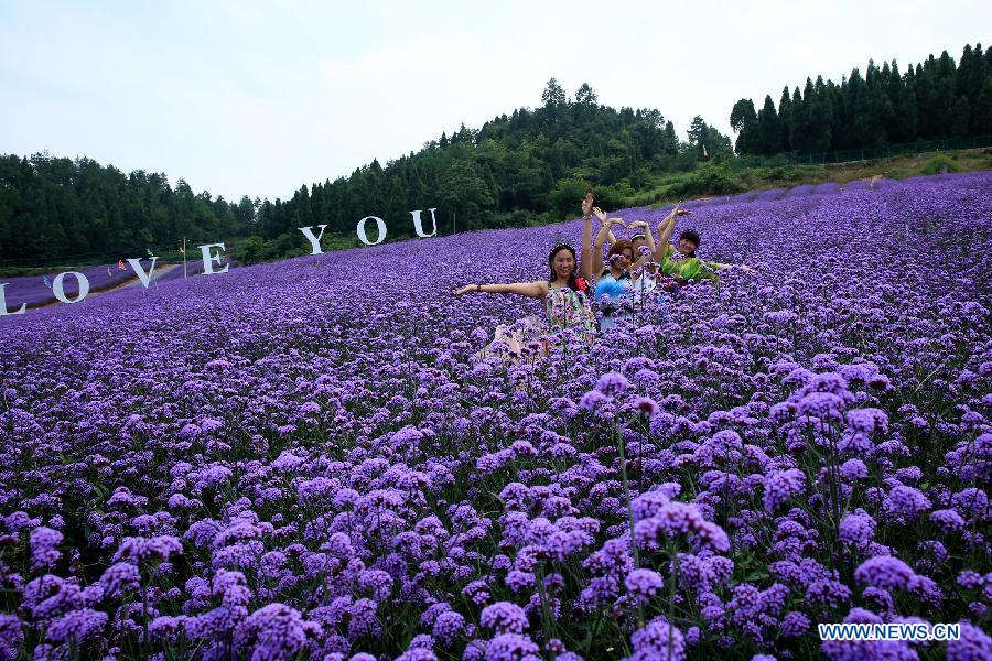 Tourists pose for photos at a lavender garden in Fenghuang County, Xiangxi Tujia-Miao Autonomous Prefecture, central China's Hunan Province, July 20, 2015. (Xinhua/Peng Biao)