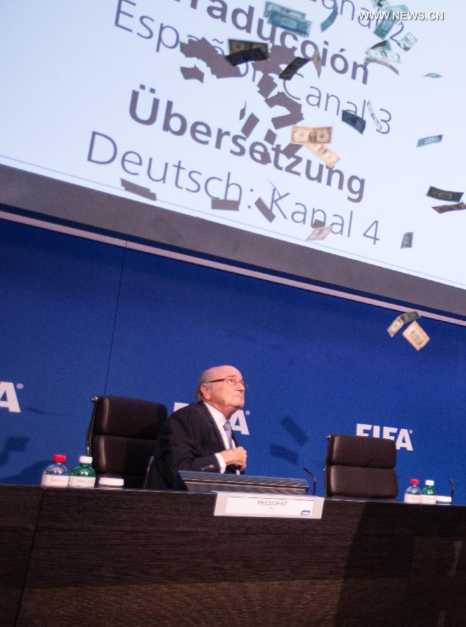 | President Sepp Blatter looks at banknotes thrown by British comedian known as Lee Nelson at a news conference after the Extraordinary FIFA Executive Committee Meeting at the FIFA headquarters in Zurich, Switzerland July 20, 2015. (Xinhua/Xu Jinquan) |