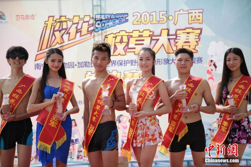A high school girl and a college freshman win the first campus beauty contest held in Guangxi on July 19, 2015. In addition, the top six competitors were selected as image ambassadors of Nanning Zoo to help raise public’s awareness of protecting wild animals and safeguarding our planet. (CNS/ Wang Gang) |