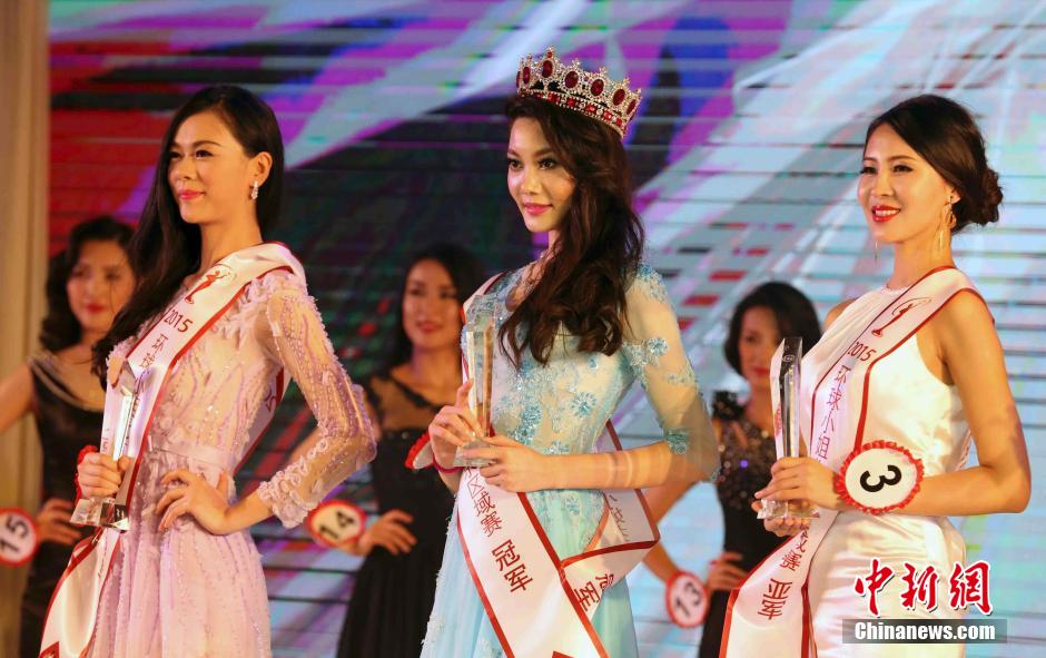 Lang Zhennan (C), winner of Miss Universe China Beijing Final 2015, poses with the runner-up (R) and the second runner-up (L) in the awarding ceremony during the Beijing regional final of the 2015 Miss Universe China Pageant in Beijing, July 19, 2015. (CNS/Ren Haixia) |