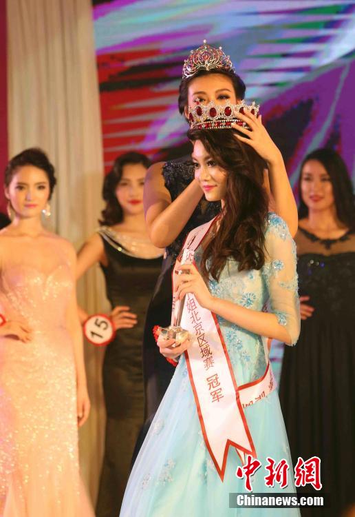 Hu Yanliang (L), winner of Miss Universe China 2014, puts the crown on the head of Lang Zhennan (R), winner of Miss Universe China Beijing Final 2015, during the Beijing regional final of the 2015 Miss Universe China Pageant in Beijing, July 19, 2015. (CNS/Ren Haixia) |