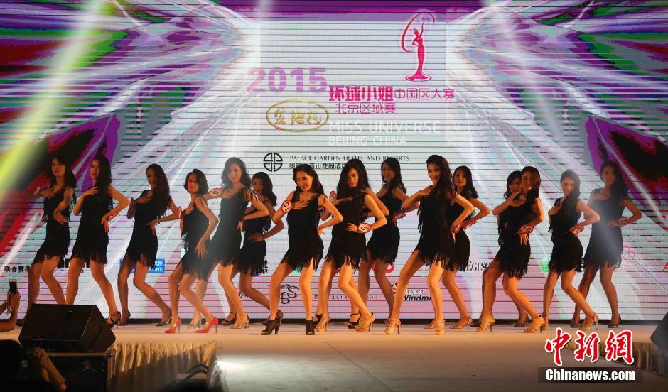 Contestants pose during the Beijing regional final of the 2015 Miss Universe China Pageant in Beijing, July 19, 2015. (CNS/Ren Haixia)