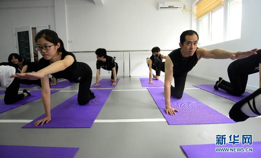 Feng Wei and his daughter do yoga together, July 21, 2015. (Xinhua/Zhao Xiaoming)