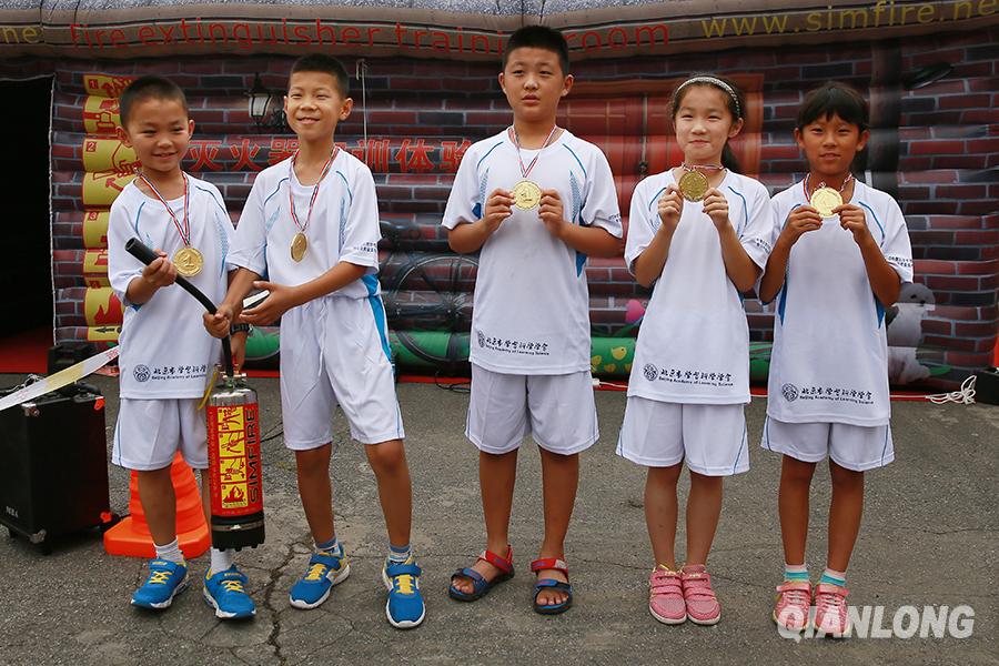 Students win medals for correctly using fire extinguishers, July 21, 2015. (Wang Zibin/Qianlong.com) |