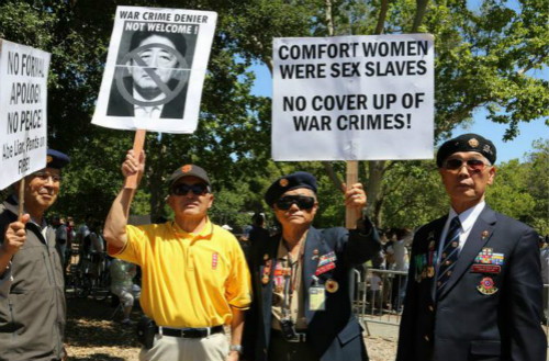 Protesters urge Japanese Prime Minister Abe to take historical responsibility for comfort women during Abe's visit to the United States on April 30, 2015. (People's Daily Online/Han Shasha) |