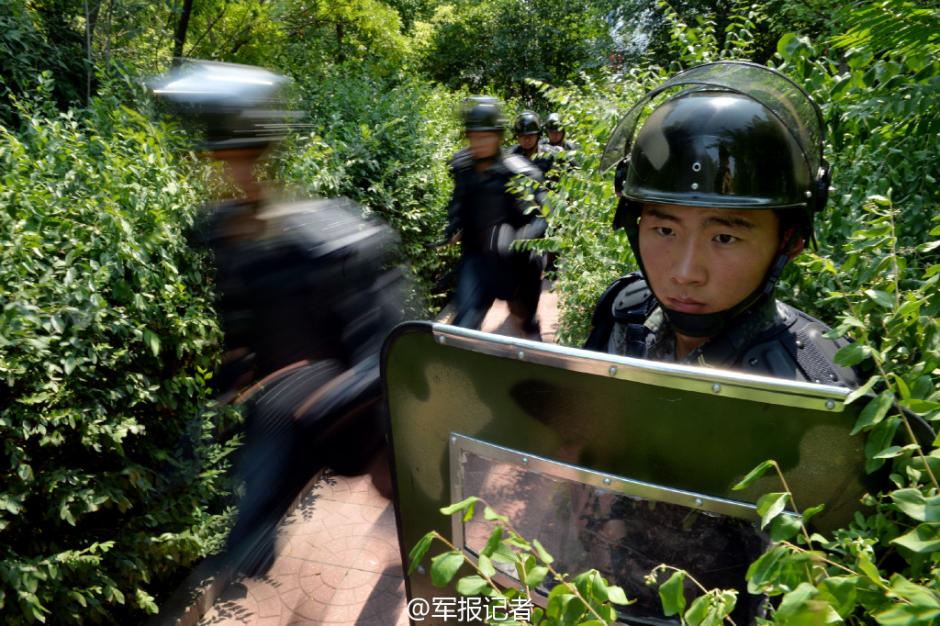 A detachment in PLA Shenyang Military Area Command takes training with new anti-terrorism equipment in middle July. The new equipment makes soldiers look like "Ironman warriors". (Photo/jz.81.cn)