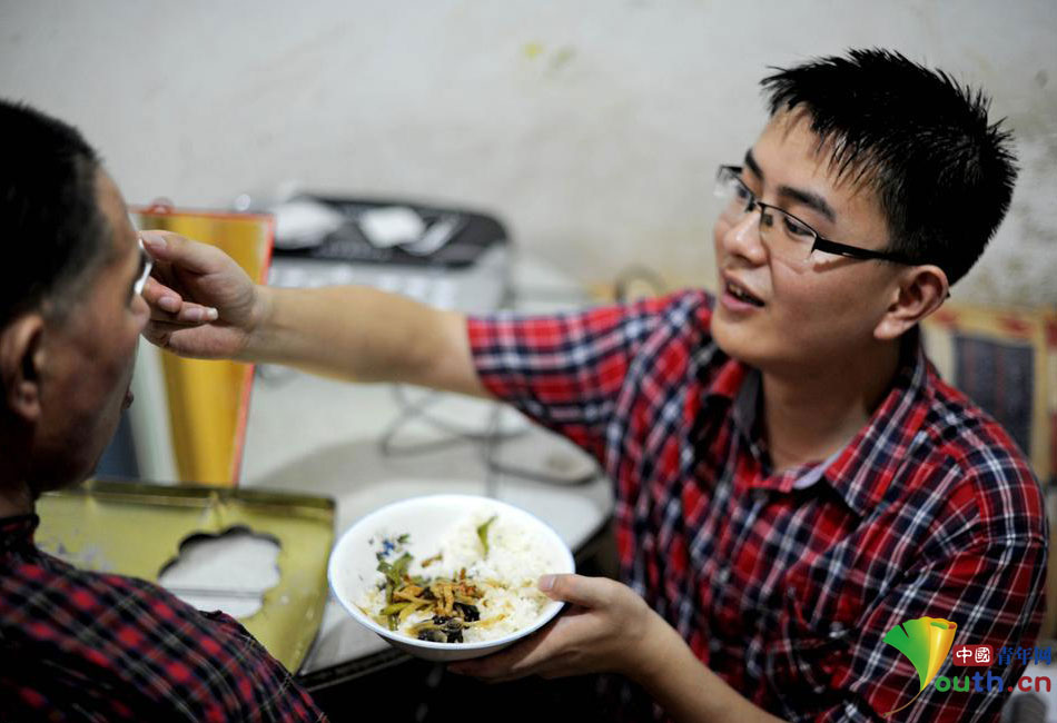 Shen Hai, a student of Huainan Normal University in Anhui Province, studies in the university while taking care of his sick parent. He buys vegetables every night, cooks in the morning and helps his parents do rehabilitation training. On campus, he distributes leaflets, works as an agent and sells lunch boxes to earn living expenses.