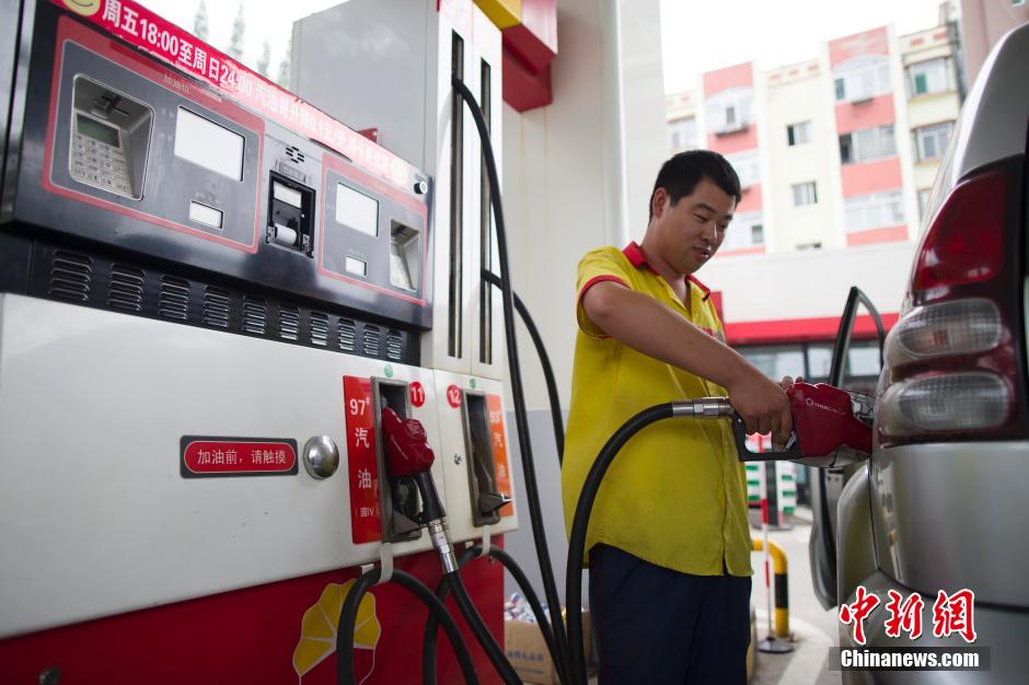 A worker gets fuel for the car in a gas station in Taiyuan, Shanxi Province on July 21, 2015. ( Photo by China News Service / Zhang Yun )