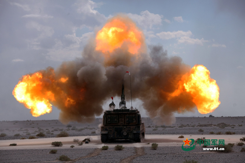 A new-type self-propelled gun fires in a live fire drill held by the 1st Group Army in the desert on July 21, 2015. (Photo/www.81.cn)