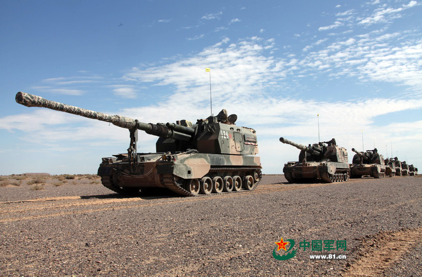 A new-type self-propelled gun fires in a live fire drill held by the 1st Group Army in the desert on July 21, 2015. (Photo/www.81.cn)