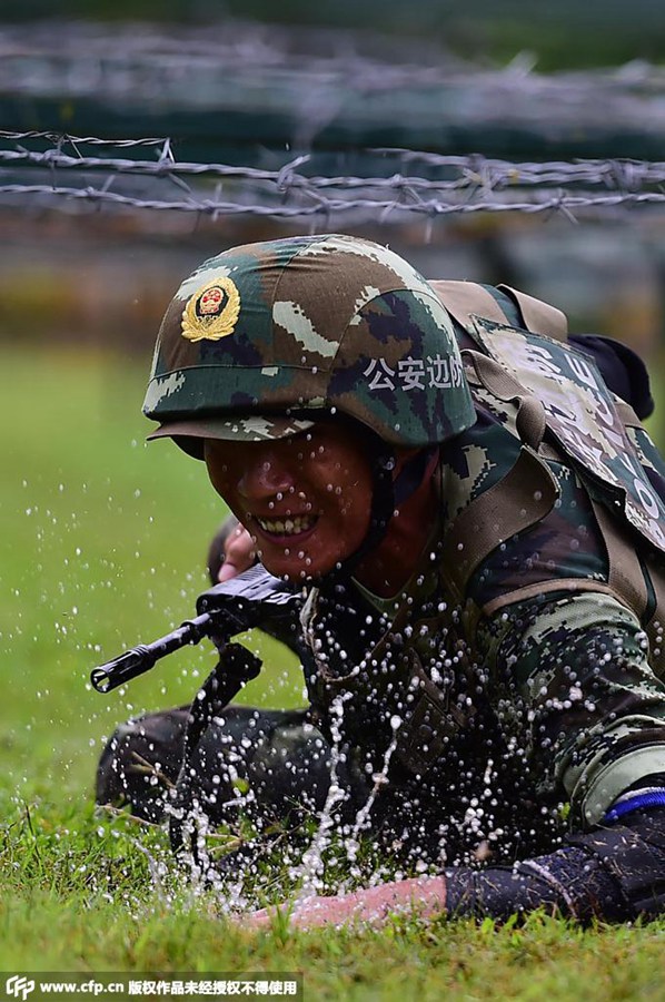 The SWAT team of People's Armed Police Frontier Corps in Guangdong, also known as the "iron army", held a military skill competition under thunderstorm in the heat on July 22, 2015. Five teams, 31 groups, and about 231 SWAT team members joined the competition. The contest will last three days.