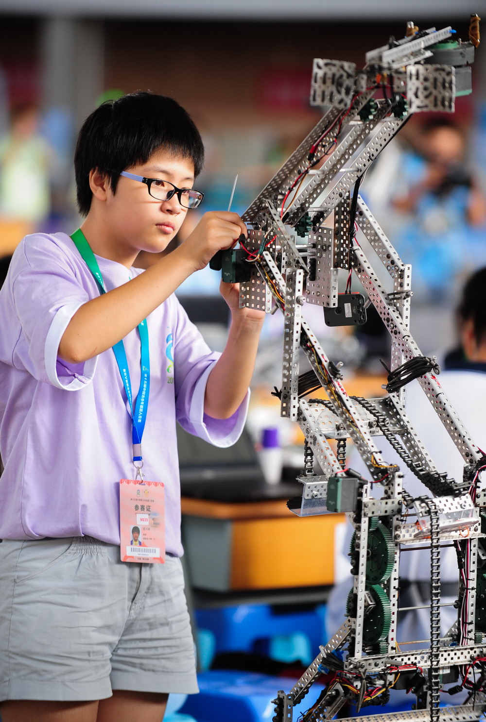 Students from Shenyang, Liaoning province overhaul robots before the competition on July 22, 2015.