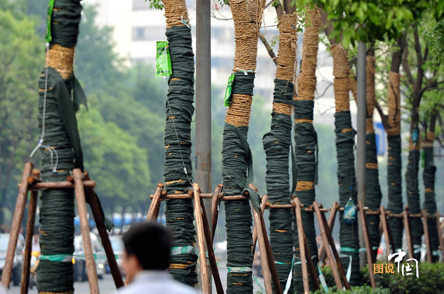 On June 4, 2012, the newly transplanted trees wear “nutrients bags” in Fuzuo Road, Nanjing, Jiangsu Province. The trees which had been transplanted needed nutrition liquid to enhance their resistivity in the extreme hot weather. (Photo / CCTV)