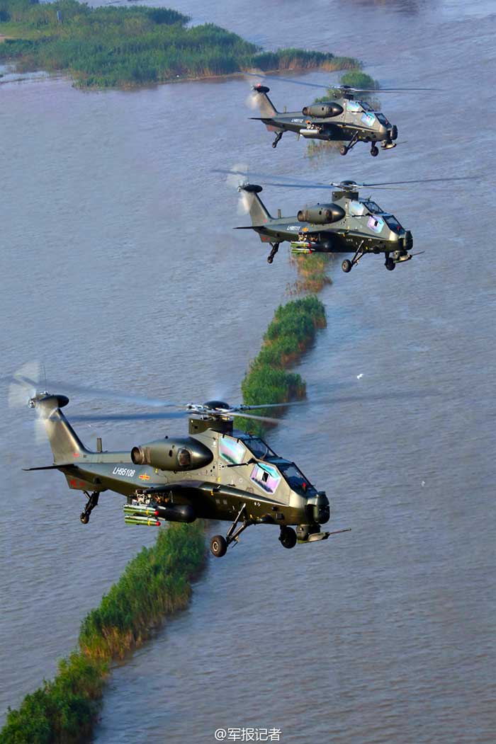 WZ-10 helicopters carrying missiles under the Nanjing Military Area Command (MAC) of the Chinese People's Liberation Army (PLA) conduct a drill over the sea on July 21, 2015. (81.cn/Photo)
