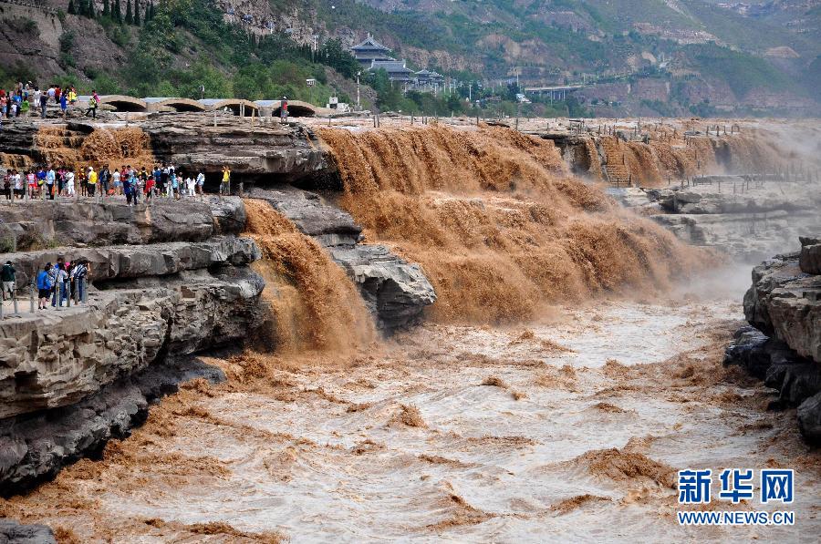 Affected by the heavy rains upstream, the Hukou Waterfall of the Yellow River, lying at the juncture between Shanxi and Shaanxi provinces ushers in summer flood. The magnificent scene attracted many visitors and shutterbugs. (Photo by Xinhua News Agency/ Lyu Jiaming)