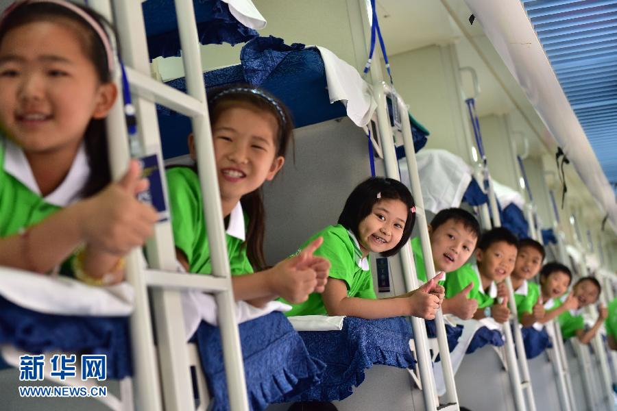 On July 21, 100 left-behind children aboard a train which is specially designed to offer them a free ride leave Nanchong, Sichuan province to Shenzhen, Guagnzhou and other cities to meet their parents.