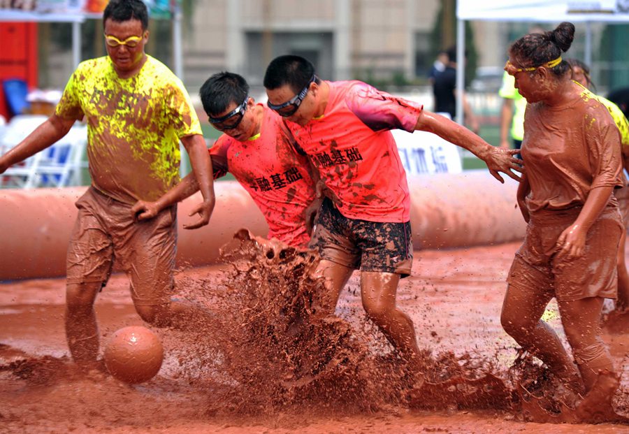 China’s mud football match kicked off in Beijing on July 23, 2015. Mud football fans from all walks of life competed in the mud.