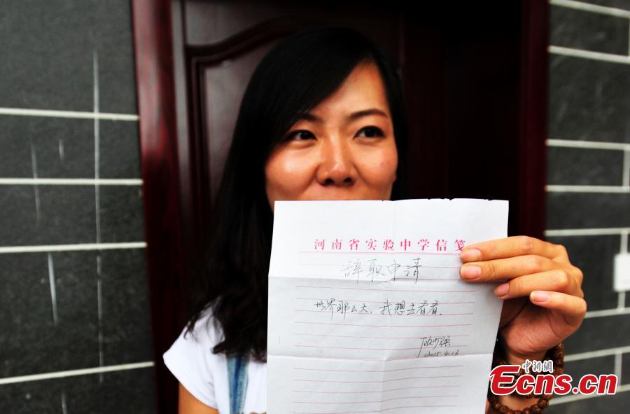 Gu Shaoqiang shows her resignation letter that says "The world is big and I want to see it” in Jiezi Old Town in Chongzhou city, Southwest China’s Sichuan province. Gu caused an online sensation and to some extent has become a heroine to an adventure-hungry generation of working Chinese with her resignation letter of 10 Chinese characters - "The world is big and I want to see it”. She resigned from a middle school in April, and the latest development is that she didn’t actually go to see the world. Instead, she found unexpected love and decided to settle down with her husband in the old town. (Photo: China News Service/An Yuan)