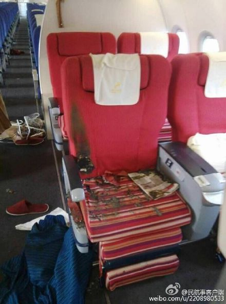 Inside the cabin of Shenzhen Airlines Flight ZH 9648 after the flight crew and passengers immediately overpowered a passenger after he was found trying to damage facilities.[Photo/Weibo]