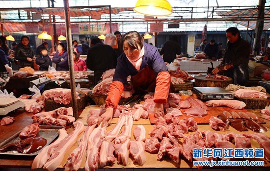 A pork stall at the market. (Photo/Xinhua) |