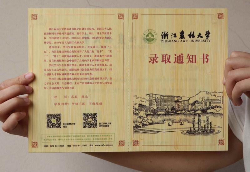 The admission letter of Zhejiang A&F University is made of bamboo. (Photo/People's Daily Online)
