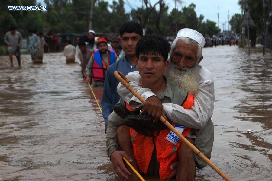 A rescuer carries a man on his shoulders as he and others walk through flooded area in northwest Pakistan's Peshawar on July 26, 2015. At least 43 people were killed, hundreds of others injured and tens of thousands displaced in flooding and rain-related accidents in Pakistan's Punjab, Khyber Pakhtunkhwa and Balochistan, local media and officials said Saturday. (Xinhua/Umar Qayyum) |