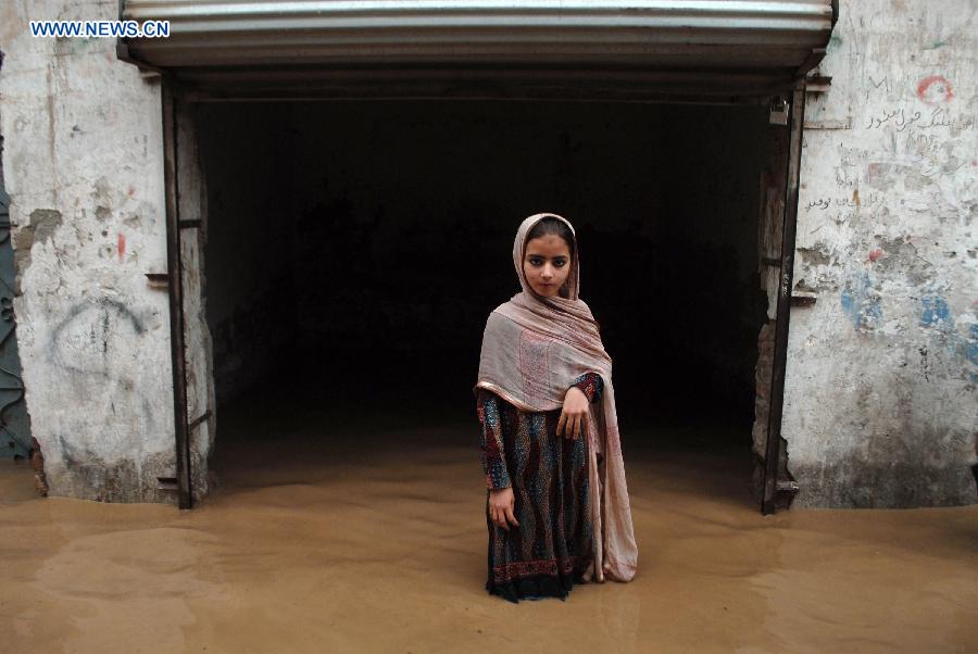 A girl stands in a flooded area in northwest Pakistan's Peshawar on July 26, 2015. At least 43 people were killed, hundreds of others injured and tens of thousands displaced in flooding and rain-related accidents in Pakistan's Punjab, Khyber Pakhtunkhwa and Balochistan, local media and officials said Saturday. (Xinhua/Umar Qayyum) |