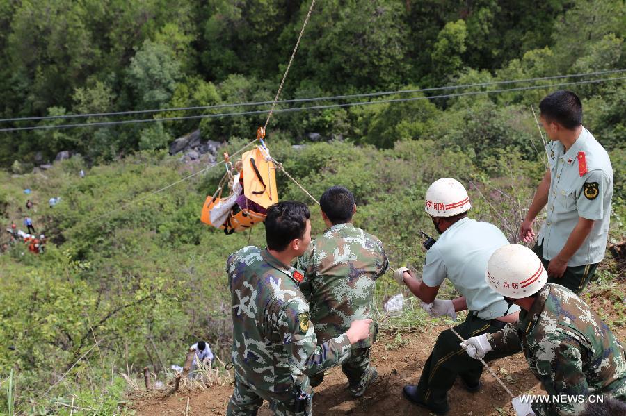 Rescuers conduct rescue work at the site of a minibus crash on a mountain road in southwest China's Yunnan Province, July 27, 2015.
