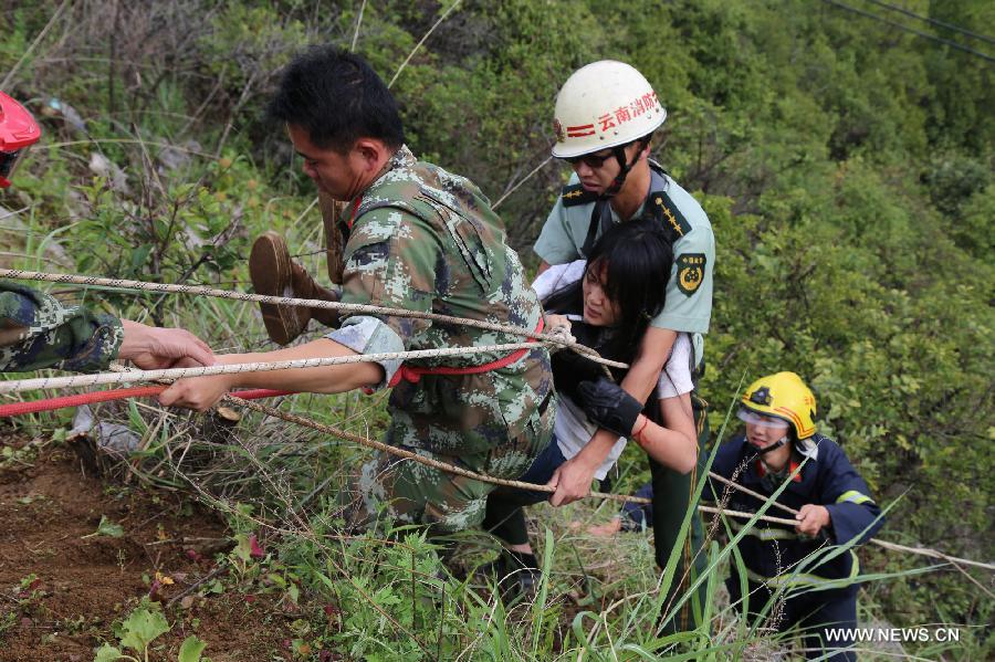 A woman gets rescued at the site of a minibus crash on a mountain road in southwest China's Yunnan Province, July 27, 2015.
