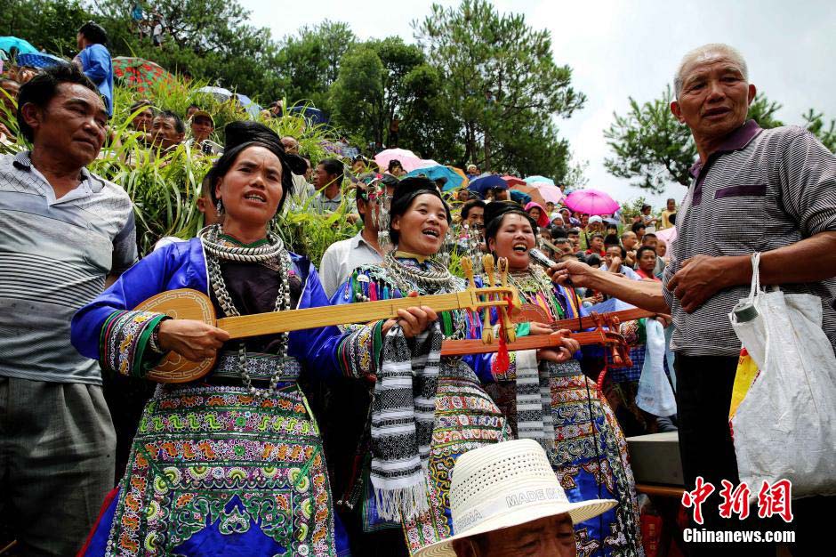 Miao people (Miao, an ethnic minority of China) celebrate traditional “Chixin Festival” in Rongjiang county, southwest China’s Guizhou province on July 22, 2015. A bull fighting competition was held for celebration. (CNS/Li Changhua)