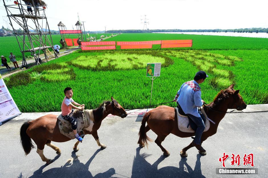 The “2015 Rice Field Cartoon Festival” is held in the testing site of “Yuan Longping super rice” Kangyuan ecological farm in Hangzhou, east China’s Zhejiang province on July 26, 2015. The agricultural science research team of Zhejiang University created cartoon works with the world’s first four-color rice in the field, which have attracted many tourists. (CNS/Li Zhong)