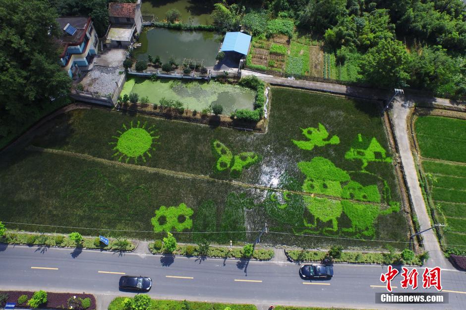 The “2015 Rice Field Cartoon Festival” is held in the testing site of “Yuan Longping super rice” Kangyuan ecological farm in Hangzhou, east China’s Zhejiang province on July 26, 2015. The agricultural science research team of Zhejiang University created cartoon works with the world’s first four-color rice in the field, which have attracted many tourists. (CNS/Li Zhong) |