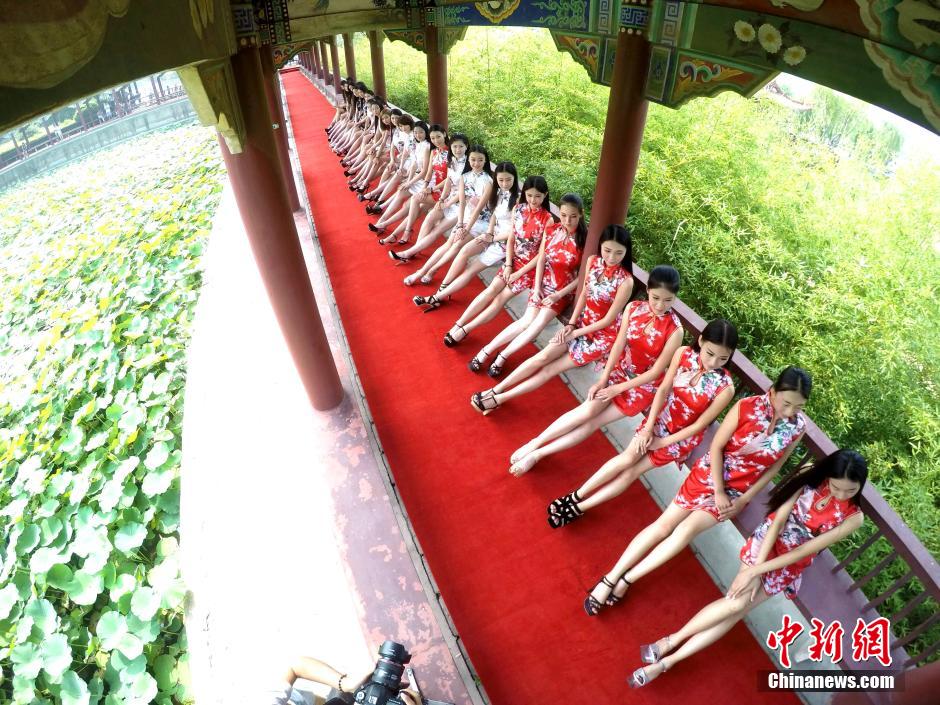 Contestants for this year's Miss Bikini Universe Henan Final show their beautiful long legs in cheongsam at a villa in Dengfeng city, central China's Henan Province, July 25, 2015. (CNS/Wang Zhongju)