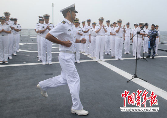 Ling runs to the microphone to give a speech at the discharge ceremony held for him on the "Weishanhu" ship. (Photo/www.cyol.net)