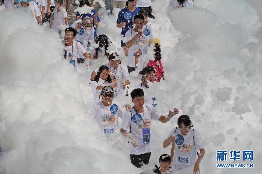 Citizens run across the “bubble rain” in Yantai, Shandong province on July 25, 2015. A bubble carnival was held in Yantai, Shandong. Hundreds of citizens ran across the “bubble rain” to experience the coolness and happiness in hot summer day. (Photo by Xinhua News Agency/ Tangke)