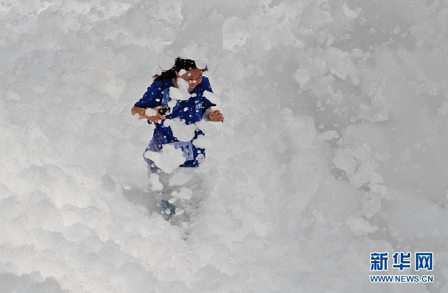 Citizens run across the “bubble rain” in Yantai, Shandong province on July 25, 2015. A bubble carnival was held in Yantai, Shandong. Hundreds of citizens ran across the “bubble rain” to experience the coolness and happiness in hot summer day. (Photo by Xinhua News Agency/ Tangke)