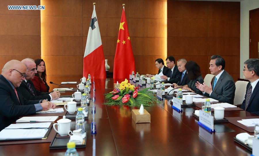 Chinese Foreign Minister Wang Yi (2nd R) holds talks with his Maltese counterpart George Vella (2nd L), in Beijing, China, July 27, 2015. (Xinhua/Ding Haitao) |