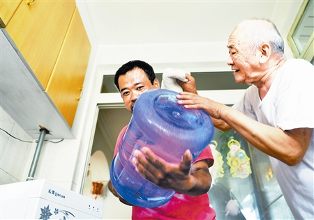 Li delivers water to the home of his first client Chen Shuangren, who is an 83 years old man living in Chao Yuanli.(Photo/Tonight News Paper)