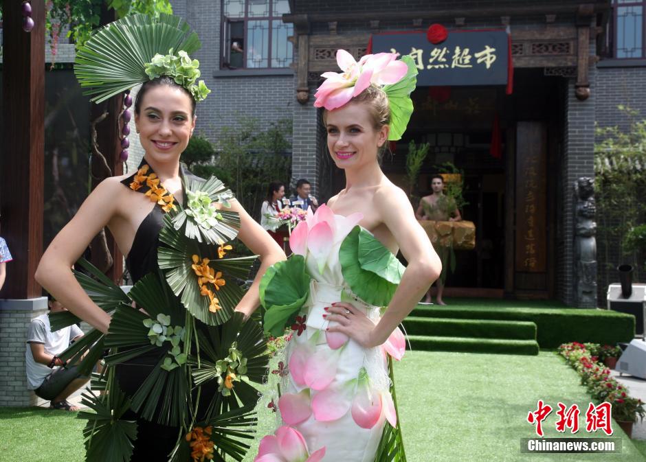 Models stage a green fashion show in Ningxiang county, central China's Hunan province, July 25, 2015. Maria, a Russian green fashion designer, held a creative fashion show themed on nature with fruits and vegetables. (CNS/Deng Xia)