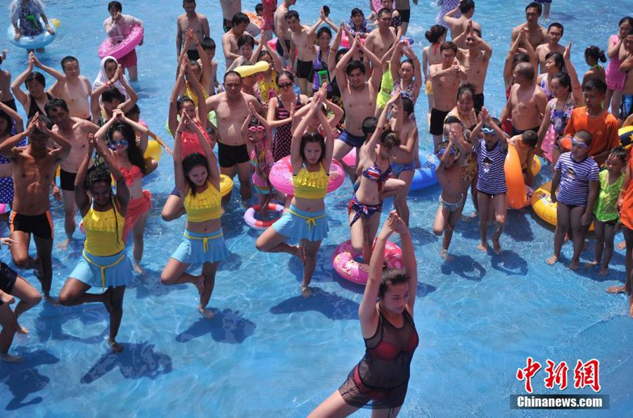 Yoga practitioners demonstrate movements in water in a water park in Chongqing on July 27, 2015. The highest temperature approached 40 degrees Celsius that day. (CNS/ Chen Chao)