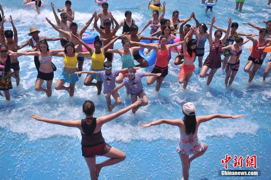 Yoga practitioners demonstrate movements in water in a water park in Chongqing on July 27, 2015. The highest temperature approached 40 degrees Celsius that day. (CNS/ Chen Chao)