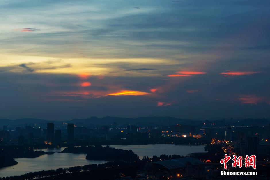 Gorgeous sunset glow appears in the sky over Nanjing city toward the evening of July 27, 2015. The red glow broke through the clouds just like a giant natural neon lamp. (Photo by China News Agency/ Fang Dongxu)