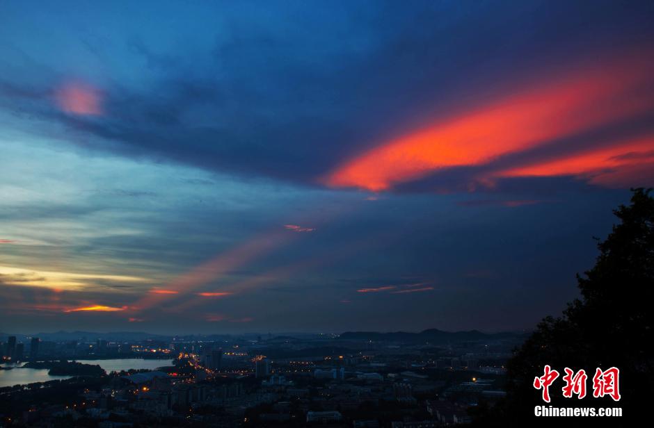 Gorgeous sunset glow appears in the sky over Nanjing city toward the evening of July 27, 2015. The red glow broke through the clouds just like a giant natural neon lamp. (Photo by China News Agency/ Fang Dongxu)