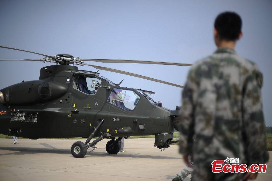 A pilot walks past a Z-10 helicopter at a base in Liaocheng, East China’s Shandong province, July 28, 2015. The "Thunder" aerobatics team is the first helicopter aerobatics team of army aviation in the Chinese People's Liberation Army (PLA). Li Kuiyuan has a safe flight record of 7,000 hours, and he is also the first in the country to turn armed helicopter somersaults. The team will stage air shows at the 3rd China (Tianjin) International Helicopter Exposition scheduled in September. (Photo: China News Service/Tong Yu) |