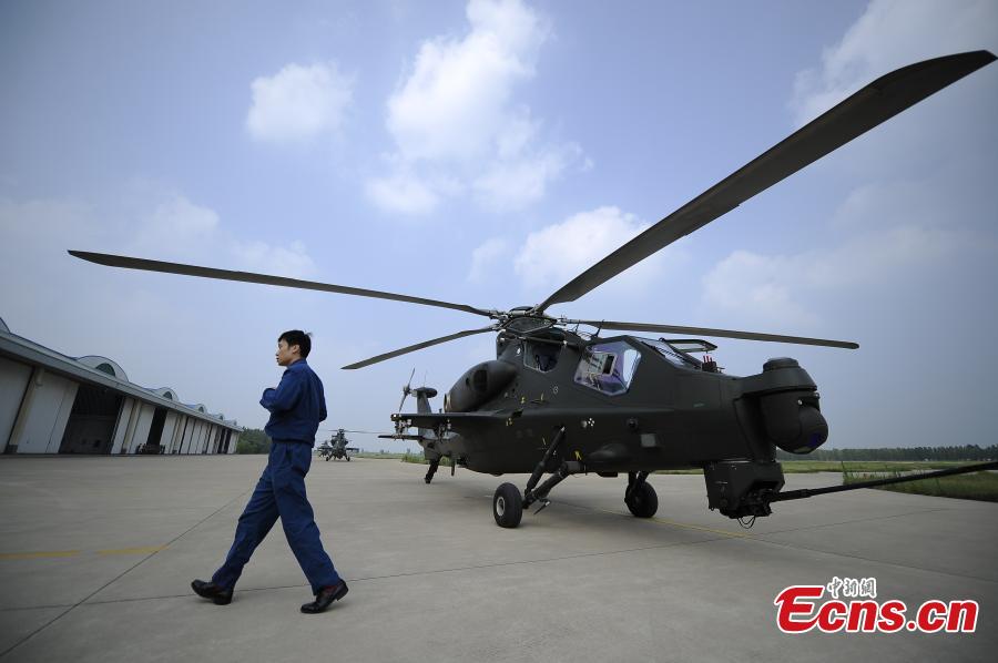 A pilot walks past a Z-10 helicopter at a base in Liaocheng, East China’s Shandong province, July 28, 2015. The "Thunder" aerobatics team is the first helicopter aerobatics team of army aviation in the Chinese People's Liberation Army (PLA). Li Kuiyuan has a safe flight record of 7,000 hours, and he is also the first in the country to turn armed helicopter somersaults. The team will stage air shows at the 3rd China (Tianjin) International Helicopter Exposition scheduled in September. (Photo: China News Service/Tong Yu) |